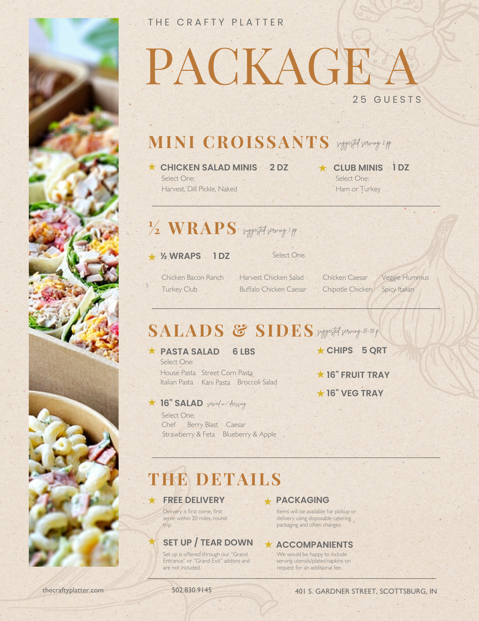 Having an event and not sure what you want? We have selected the best variety from our catering menu and put them together for you! This package is great for up to 25 guests and feature the following: