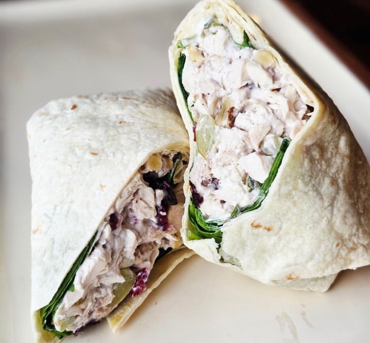 Our Harvest Chicken Salad features succulent roasted chicken (white and dark meat, broken down in house) mixed with crisp grapes, crunchy walnuts, crunchy celery, and sweet dried cranberries tucked into a large 14″ tortilla on a bed of organic spring mix.