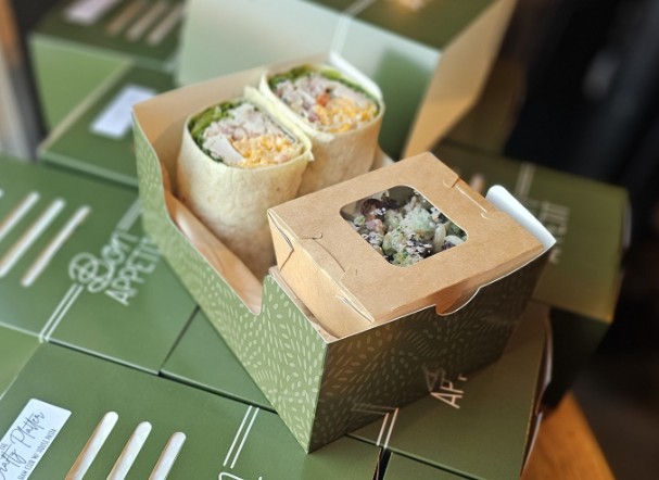 A large croissant/wrap or salad.  1 side of your choosing.  1 side of chips. 1 mini sweet treat. 1 pack of bamboo cutlery.  We also offer custom bottled lemonades for $3.50 add on. Contact us for options!